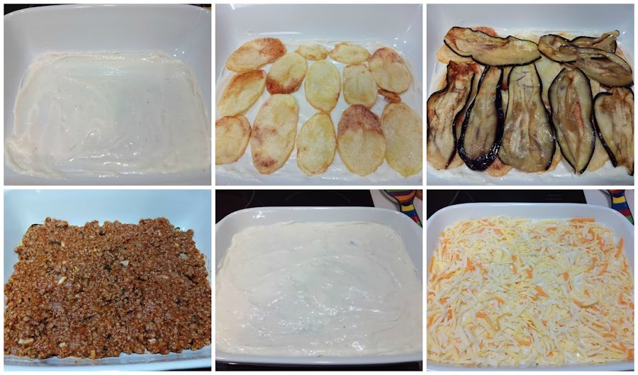 Vamos con el montaje del plato. En una fuente apta para horno extendemos una capa fina de bechamel en la base. Colocamos una capa de patatas y encima otra de berenjenas. Seguimos con una capa con la mitad del relleno de cordero y volvemos a poner encima una capa de patatas y otra de berenjenas. Terminamos con el resto de relleno y colocamos encima la ultima capa de patatas y berenjenas. Napamos con la salsa bechamel y espolvoreamos con queso rallado.