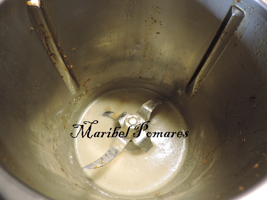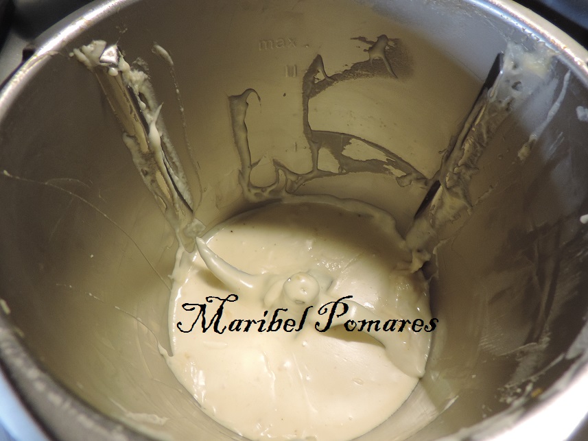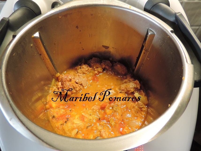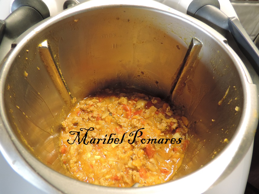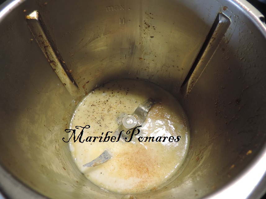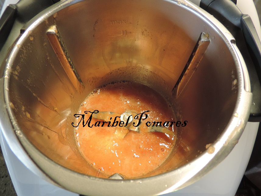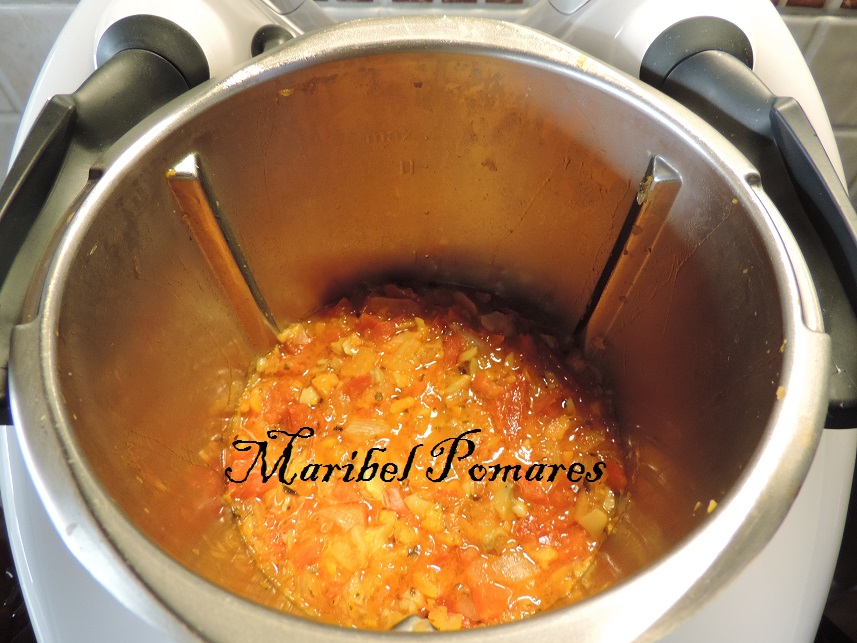 Programamos 5 minutos mas, varoma, giro a la izquierda, velocidad cuchara, sin el cubilete con el cestillo para que se evapore el agua. Lo pondremos en un bol y reservamos.
