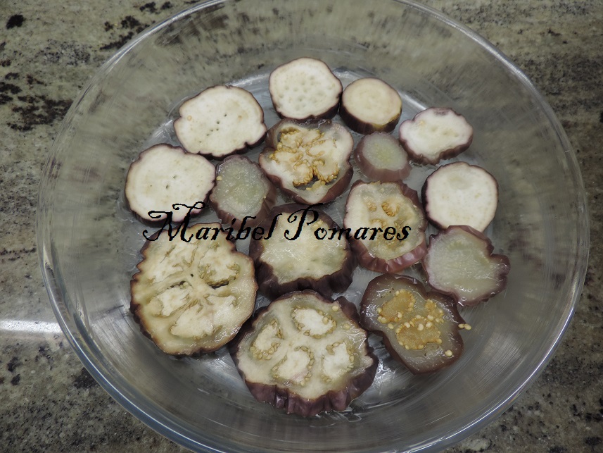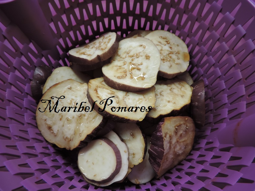 Lavamos y cortamos las berenjenas con la mandolina para que nos salgan los trozos iguales y no muy gordos y con la piel. Las ponemos en un escurridor con un poco de sal para que suelten el agua, las tendremos unos 30 minutos.