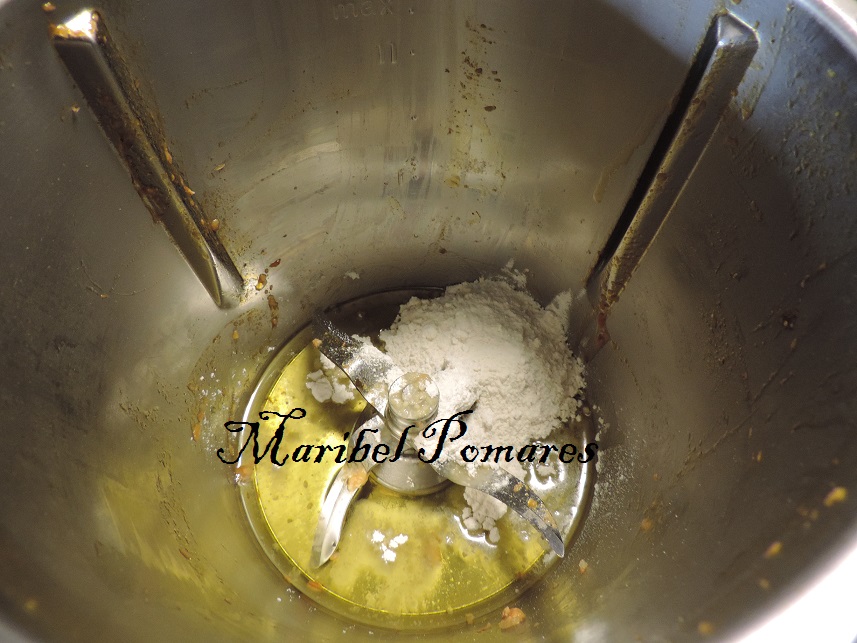 Sin lavar el vaso, añadimos el aceite de oliva y la harina.