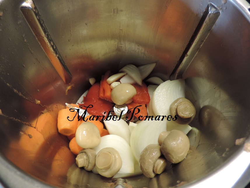 Sin lavar el vaso ponemos la cebolla, pimiento rojo, zanahoria, champiñon y diente de ajo.