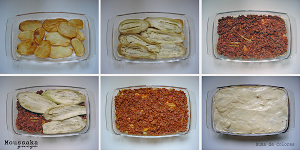 Montaje: Enmantequillar una fuente apta para horno. Sobre el fondo colocar una capa de patatas. Sobre las patatas colocar una capa de berenjenas y cubrirlas con la carne picada con tomate. Repetir el proceso: berenjenas, carne con tomate, berenjenas, carne con tomate hasta terminar con los ingredientes. Cubrirlo todo con la salsa bechamel.