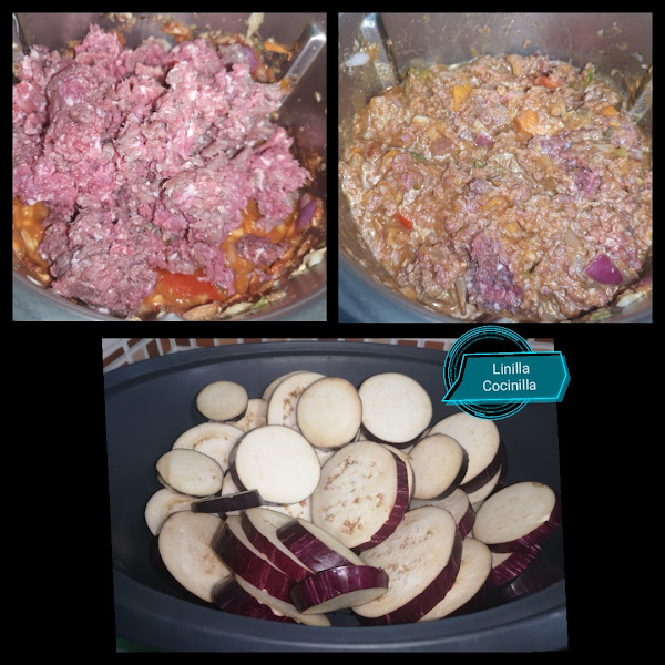 4. Incorpore la carne y remueva con la espátula. Sitúe el recipiente varoma en su posición con las berenjenas. Tape el varoma y programe 20 min/varoma/giro inverso/vel cuchara.
