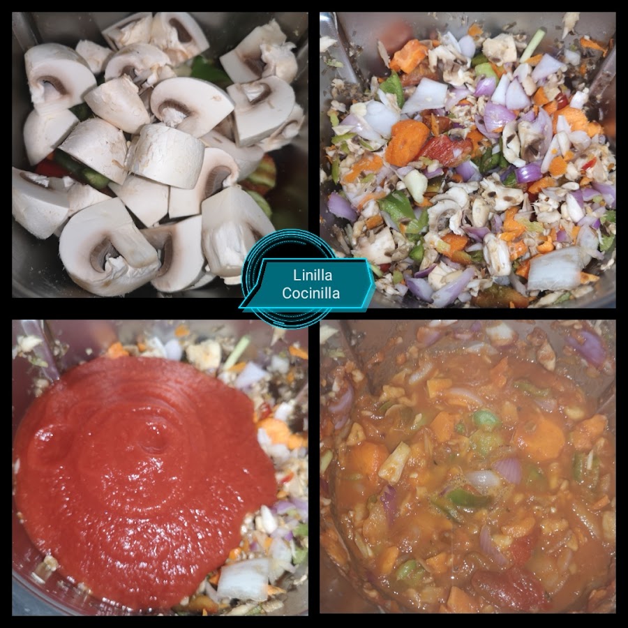 2. Ponga en el vaso la cebolla, la zanahoria, el pimiento, el ajo y los champiñones y trocee 4 seg/vel 4.