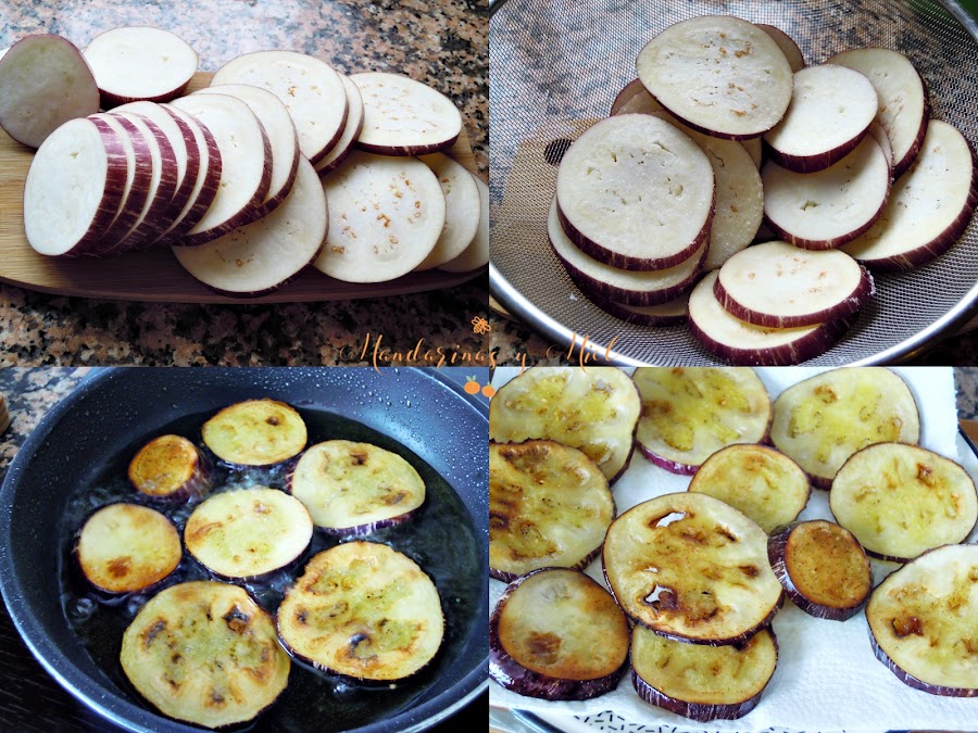 Una vez estén limpias y secas, sazona las rodajas de berenjena y fríelas en aceite de oliva, saca y reserva sobre un papel de cocina para eliminar el exceso de grasa.
