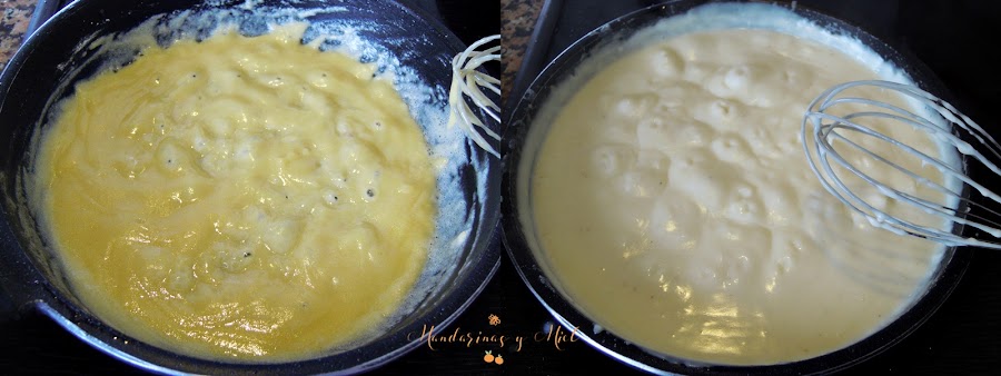 Ves echando la leche poco a poco y remueve con unas varillas sin parar, primero a fuego medio y luego a fuego lento y siempre removiendo hasta que se despegue de las paredes de la sartén y la veas cremosa, tiene que quedarte un poco más líquida que la que se hace para las croquetas, si te hace falta puedes añadir más leche. Aparta del fuego y reserva.