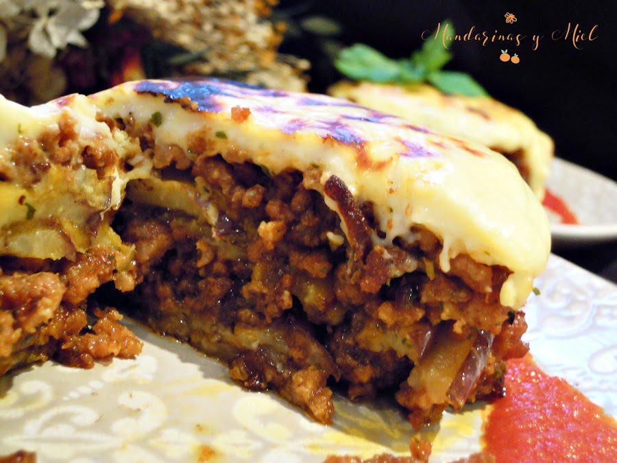 Hay varias versiones de la moussaka dependiendo del país, pero la versión más conocida es la griega, y consiste en hacer capas de carne picada y berenjena en rodajas, todo cubierto de una salsa bechamel y luego gratinado.