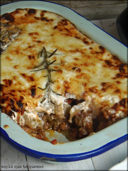 Y cual es esa variante os preguntaréis... pues que no lleva bechamel. Aunque viendo las fotos pudiera parecerlo no es bechamel es solamente un ingrediente. Os voy a dar mas pistas: tiene dos palabras, una de ellas hace referencia al país del que es originario la moussaka.