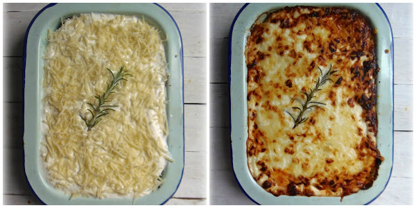 Mezclamos el yogur con un poco de queso rallado y un pelín de sal y lo ponemos por encima como última capa. Echamos mas queso rallado y lo gratinamos en el horno.