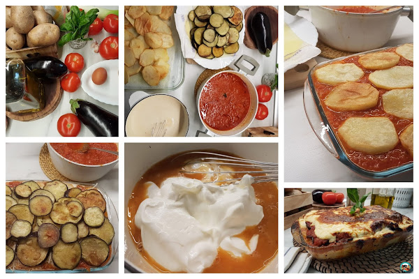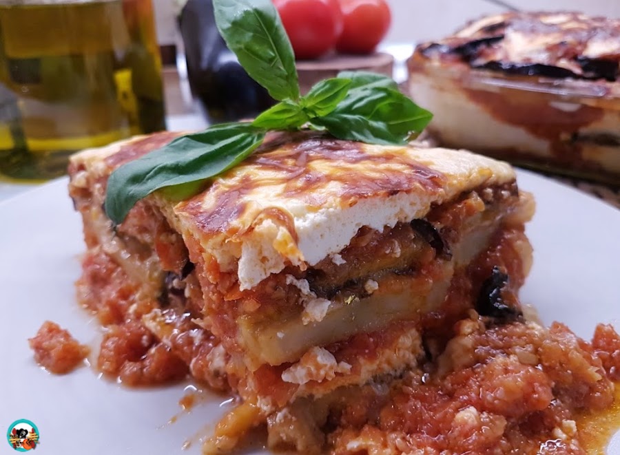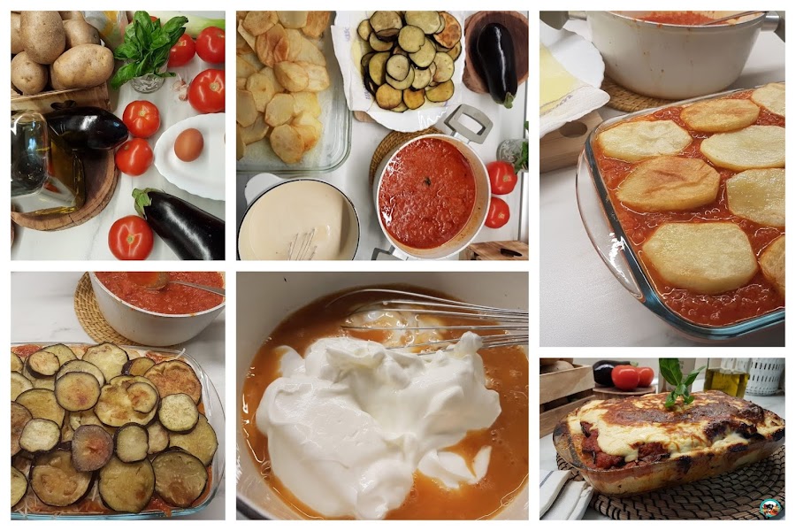 4.- Batimos los huevos con el yogur griego, salpimentamos al gusto. Preparamos la mousaka vegetariana; en una fuente de horno disponemos un toco de salsa de tomate y la extendemos por toda la fuente. Cubrimos con una camada de papas fritas, volvemos a poner salsa de tomate hasta cubrir todas las papas. Sobre la salsa disponemos en camada las berenjenas fritas, cubrimos todo con el huevo batido con el yogur. Esparcimos por encima queso rallado para fundir. Volvemos a repetir toda los pasos hasta finalizar con los ingredientes. La última capa tiene que ser de yogur con queso esparcido por encima. Cocinamos la mousaka vegetariana en el horno 40 o 45 minutos a 180º con el horno precalentado. Retiramos del horno, dejamos que la mousaka se temple unos minutos.