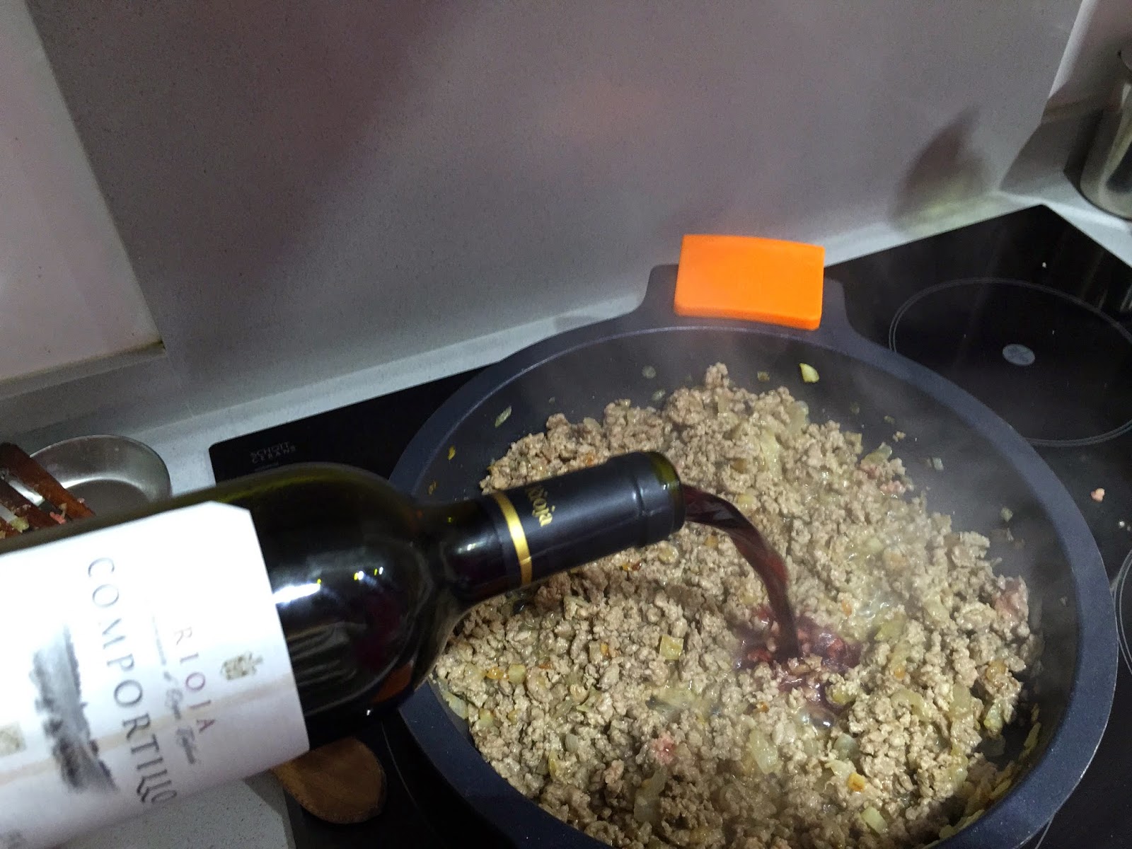 4. Cuando tome el color dorado, añadimos el medio vaso de vino tinto. Subimos el fuego y dejamos durante 2 o 3 minutos hasta que evapore el alcohol.