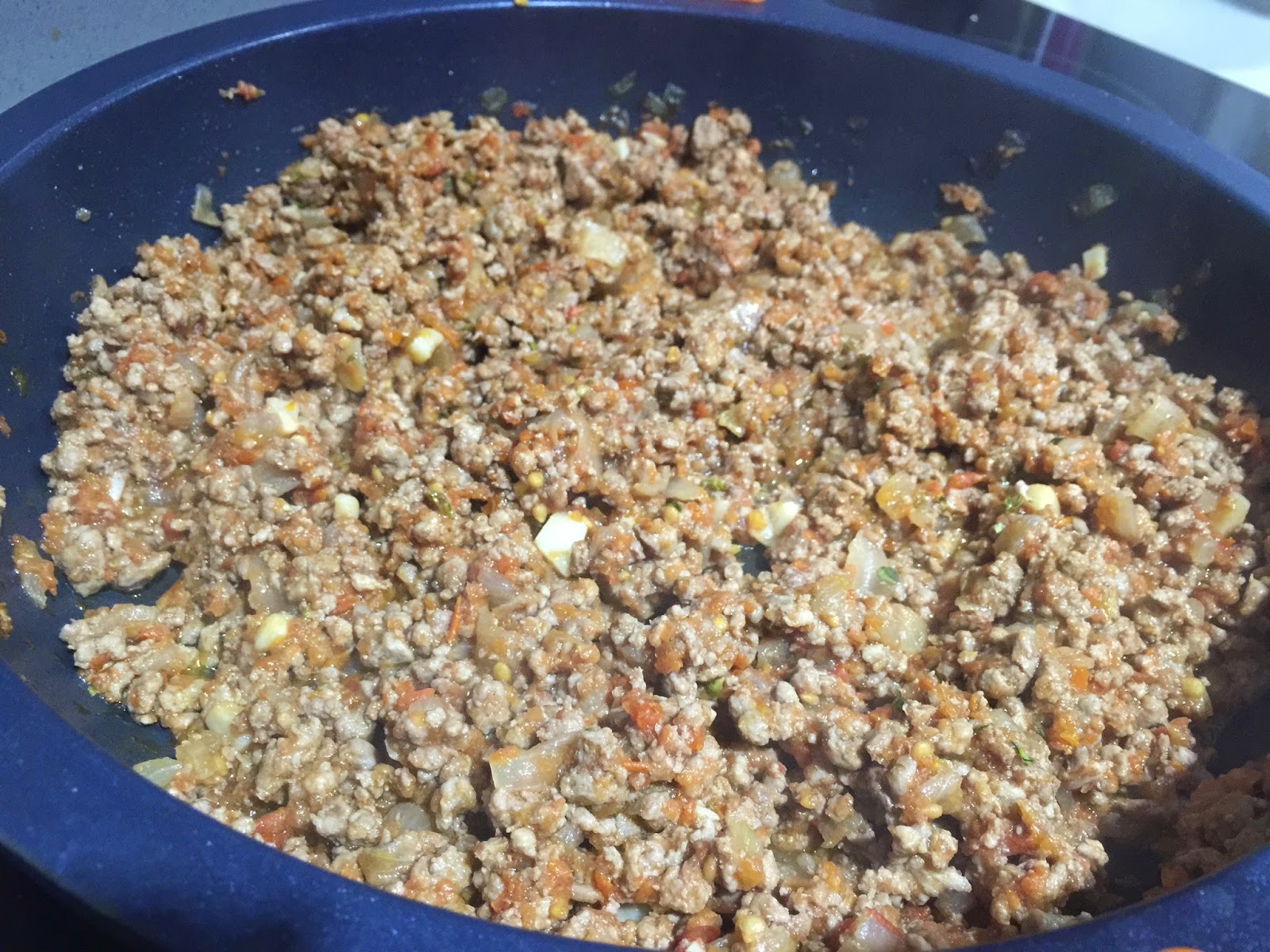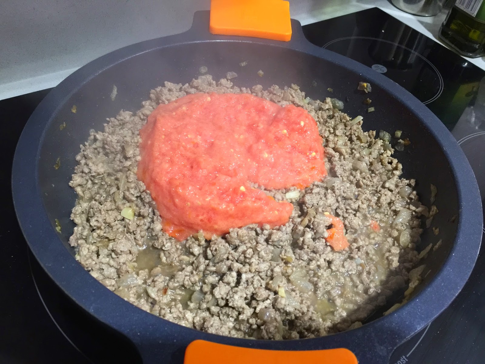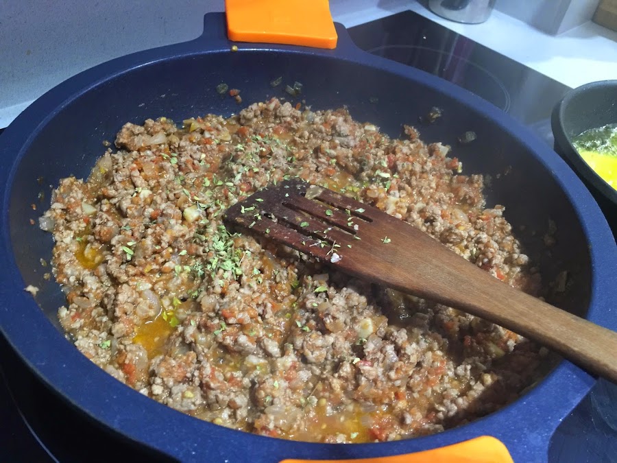5. Bajamos a fuego medio y añadimos los tres tomates triturados. Sofreimos a fuego lento durante 30 minutos, removiendo de vez en cuando para asegurarnos que no quede demasiado seco. Añadimos el orégano seco y rectificamos de sal.