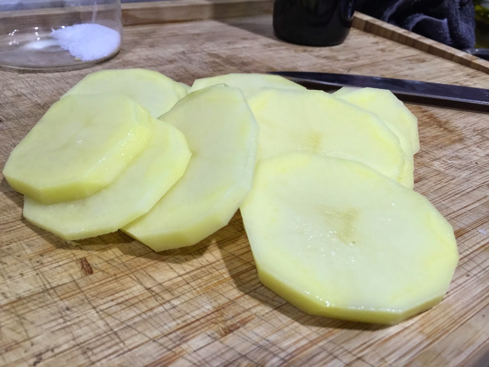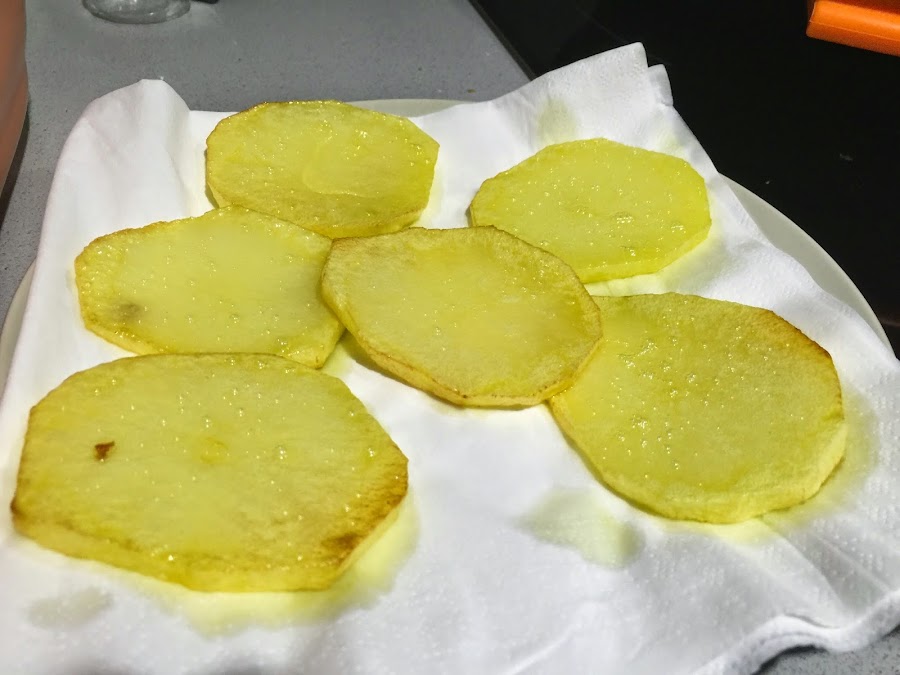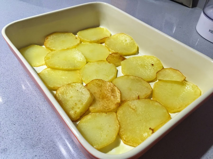 6. Pelamos las patatas, las lavamos y las cortamos en rodajas de 1 cm de grosor. Ponemos una sartén con AOVE y las freimos. No deben quedar muy doradas, se trata de que se hagan pero sin llegar a estar fritas. Como luego irán al horno acabaran de hacerse bien. Una vez fritas las escurrimos sobre papel absorvente. Después las ponemos en la bandeja cubriendo bien toda la base.