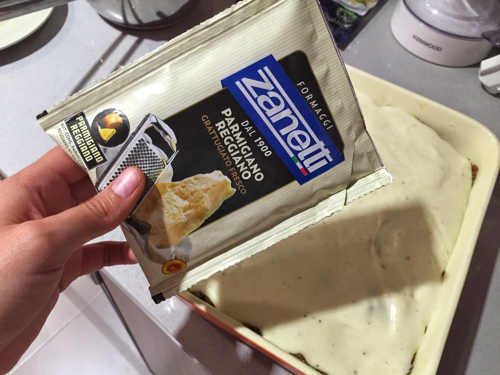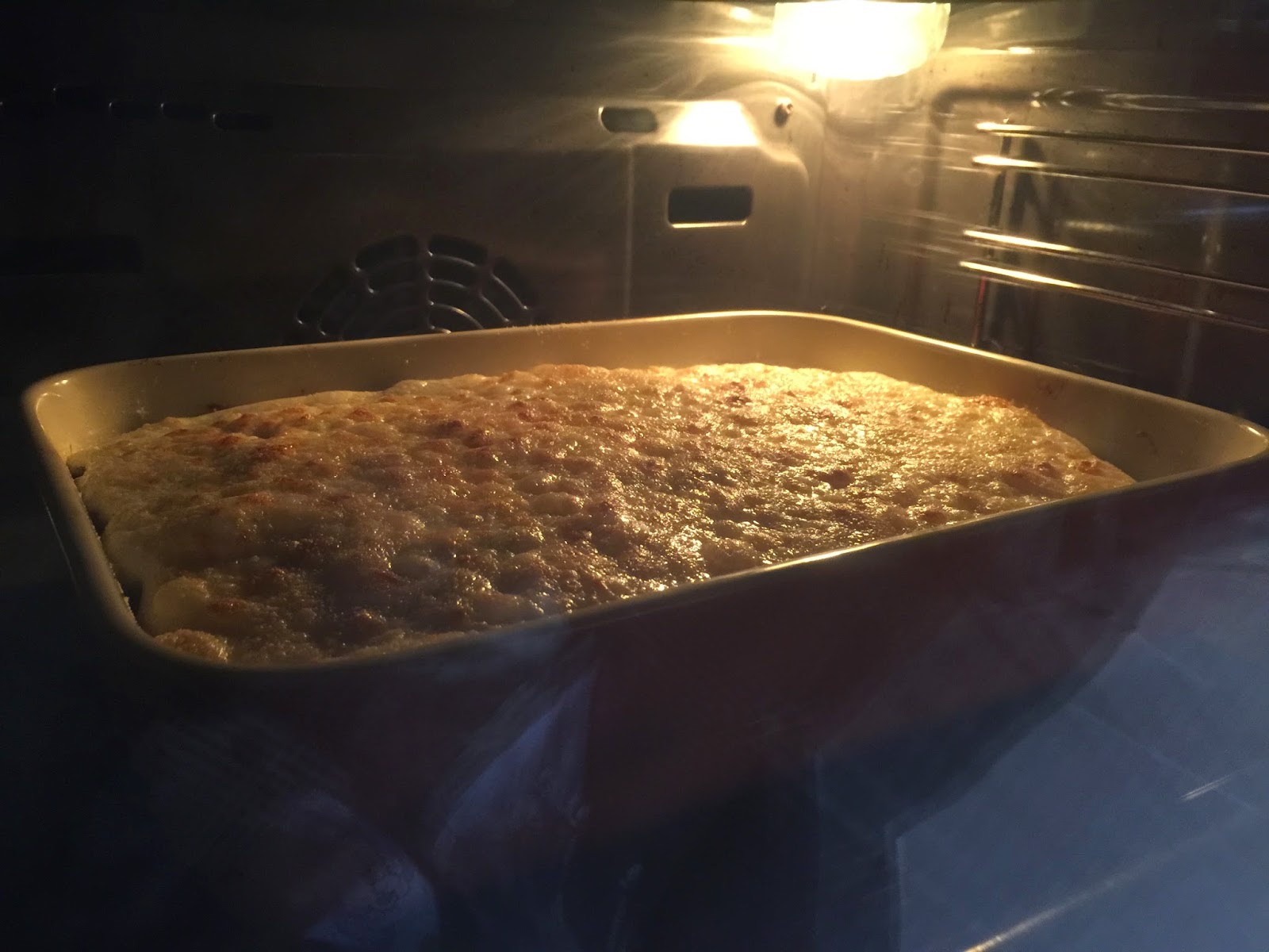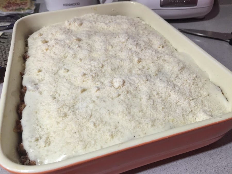 10. Volcamos la bechamel en la superficie. Ponemos encima el queso parmesano que queda y un poquito de mantequilla. Horneamos durante 20-25 minutos, hasta que tome el color doradito.