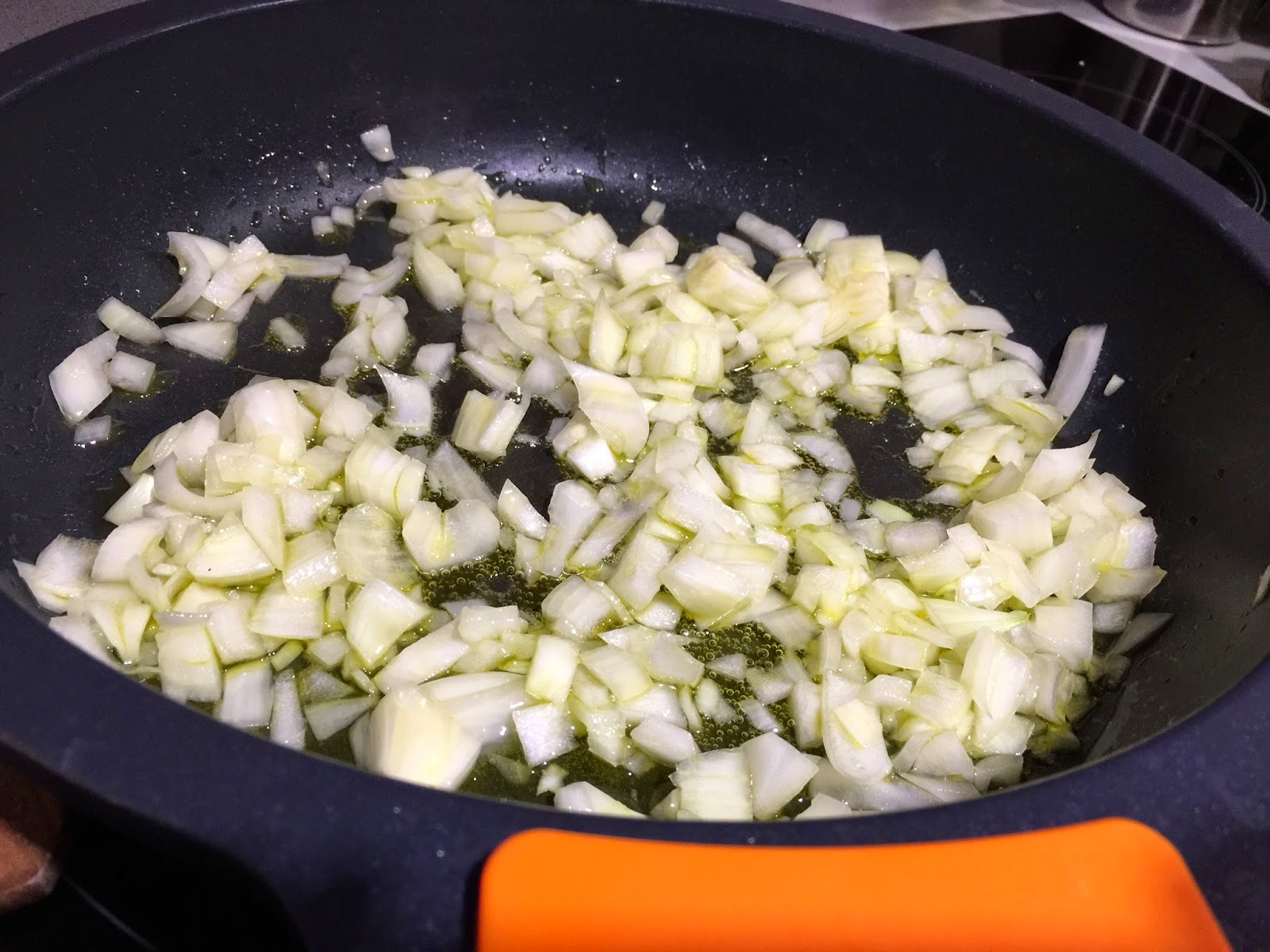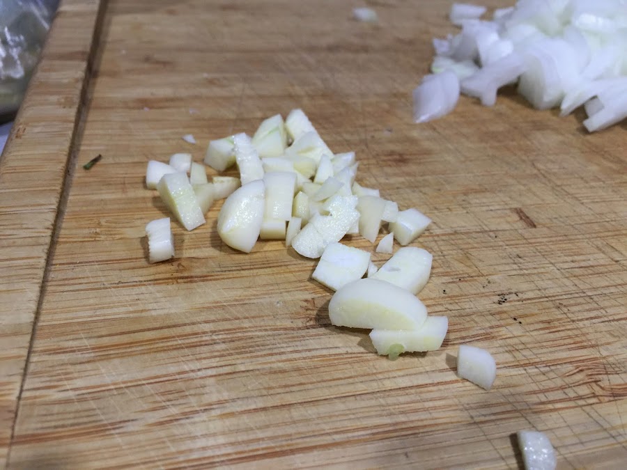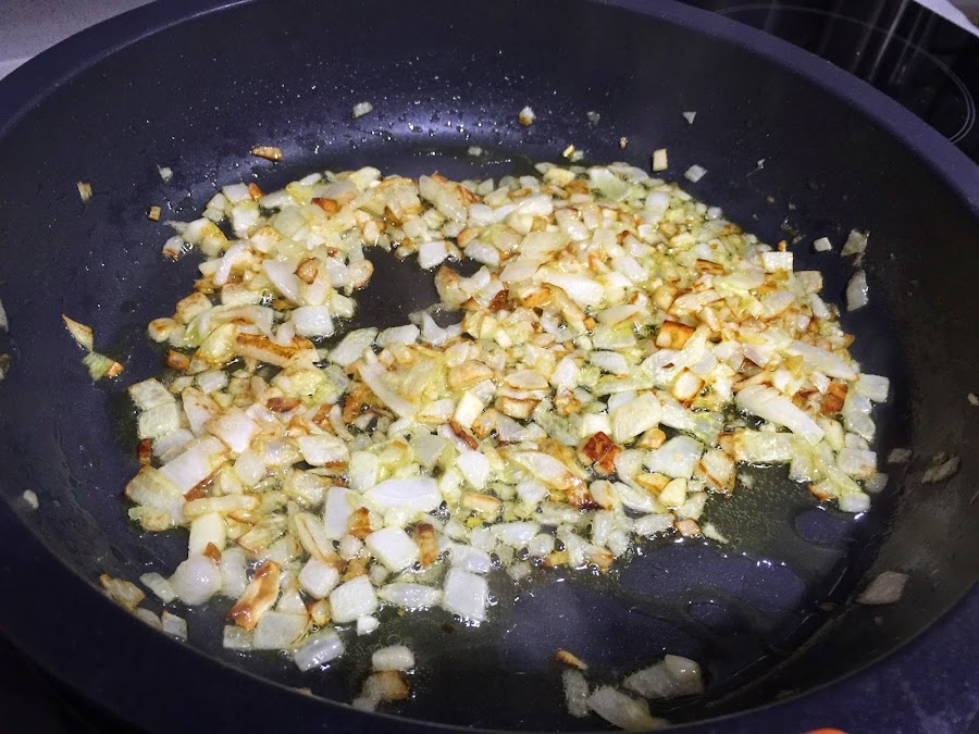 2. Mientras iremos preparando el sofrito de carne. Pelamos, lavamos y cortamos la cebolla a cuadraditos pequeñitos. La sofreimos durante 4 o 5 minutos. Añadimos los dos dientes de ajo y seguimos sofriendo.