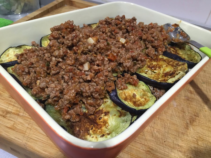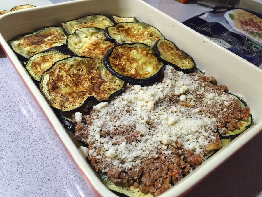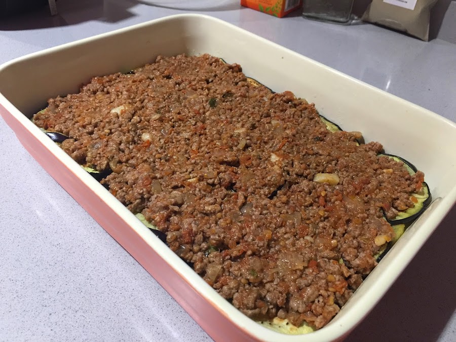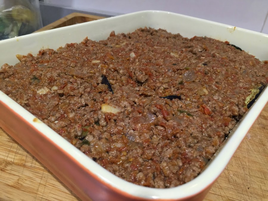 8. Encima de la capa de berenjenas ponemos la mitad del sofrito de carne. Presionamos con una cuchara para que quede uniforme. Ponemos la mitad del queso parmesano por encima. Volvemos a cubrir con el resto de berenjena que nos queda y encima de esta la otra mitad del sofrito de carne.