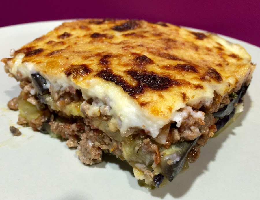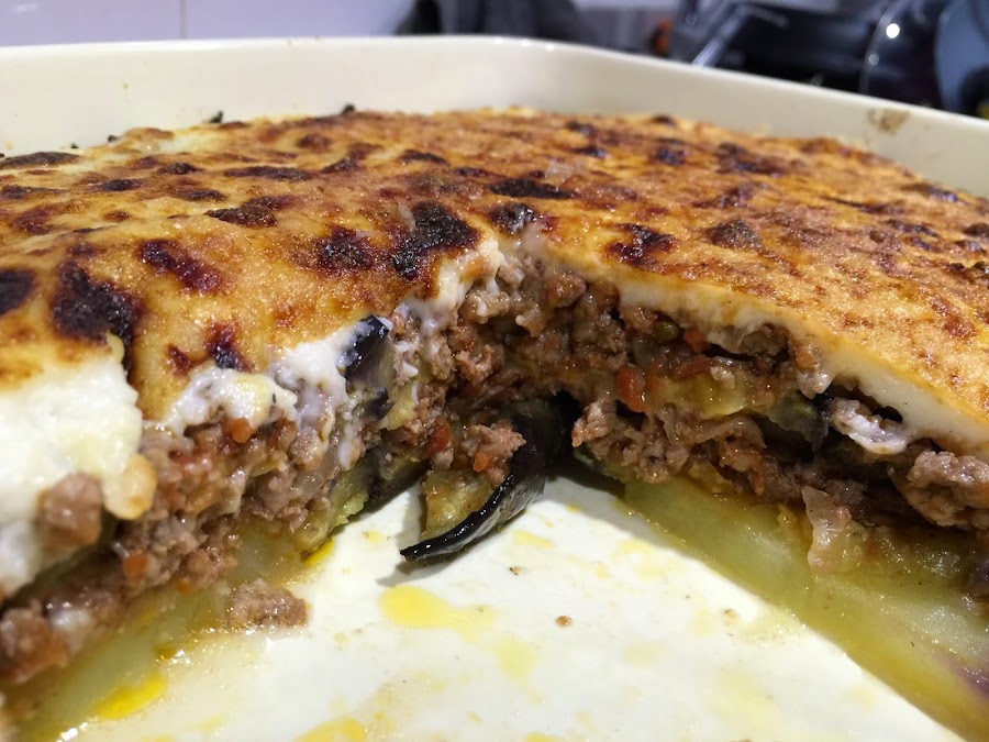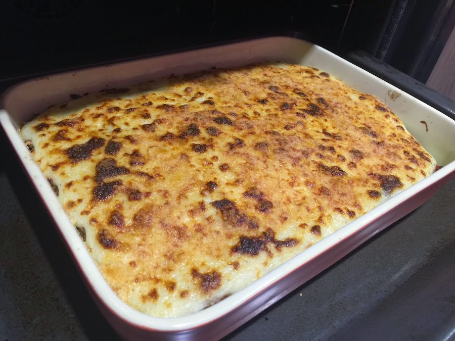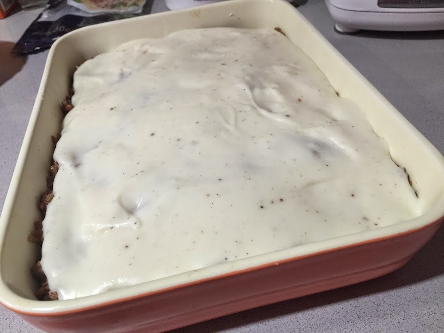 9. Hacemos la bechamel. Para ello, ponemos la mantequilla en la ollita, la derretimos a fuego medio y añadimos la harina. La doramos un par de minutos y poco a poco vamos añadiendo la leche caliente. Batiendo sin parar para que no queden grumos. Añadimos el punto de sal y la nuez moscada. Esperamos a que espese en el punto que nos guste. Si queremos que al cortar la moussaka quede en una pieza conviene que espese mas de lo habitual.