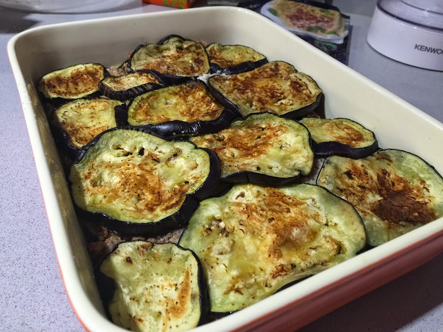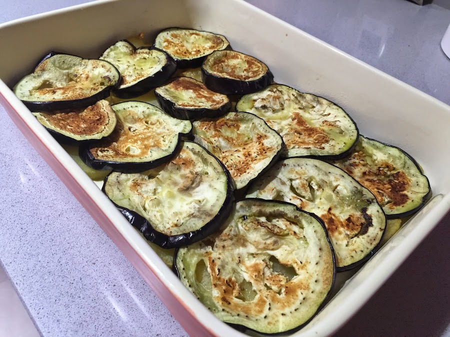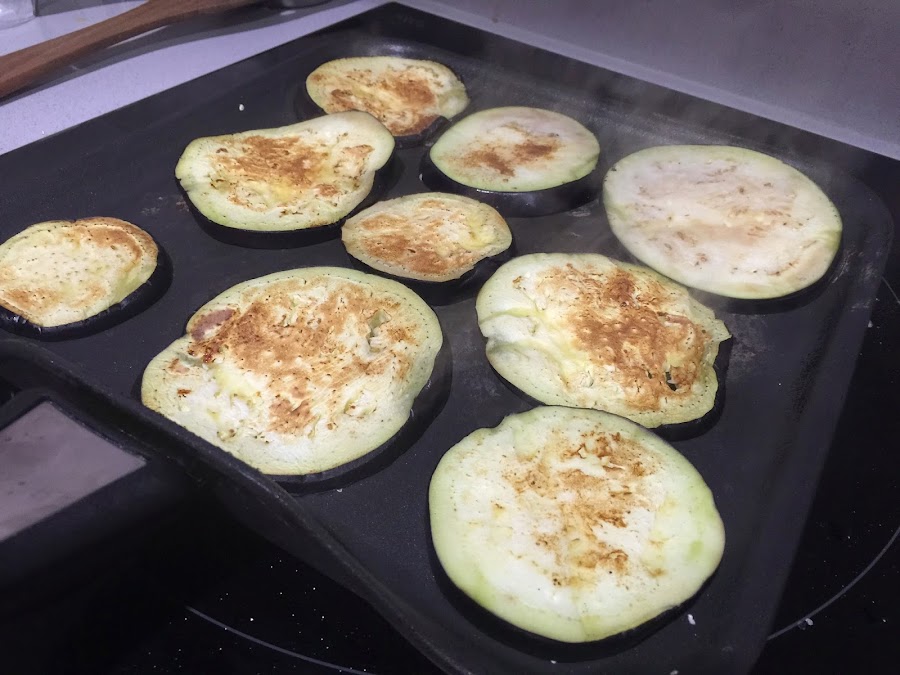 7. Hacemos las berenjenas a la plancha. En la receta original van fritas, pero prefiero hacerlas a la plancha y así no absorben nada de grasa. Sino el resultado final resulta mas grasiento y no nos gusta tanto. Cubrimos con una capa de berenjena las patatas. Conviene cubrir bien toda la base.