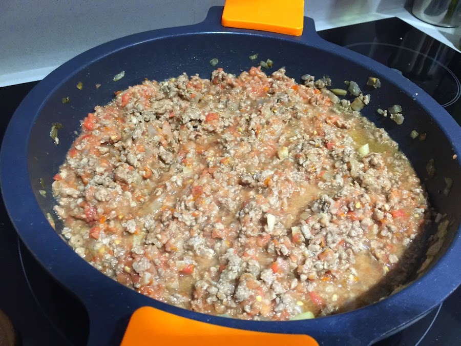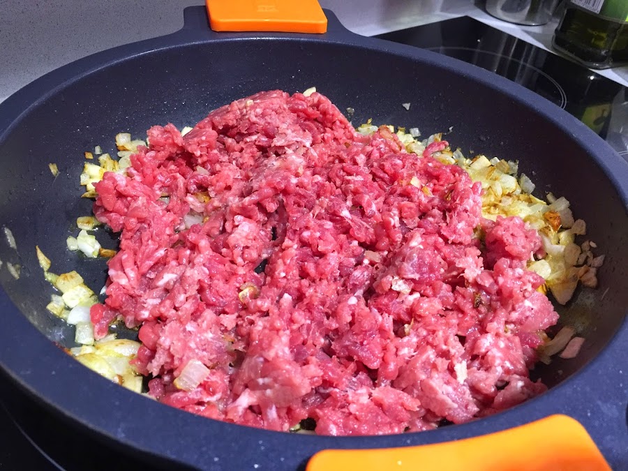 3. Añadimos la carne picada y sofreimos hasta que tome un color doradito. Siempre a fuego medio para que nada se queme. Salamos al gusto.