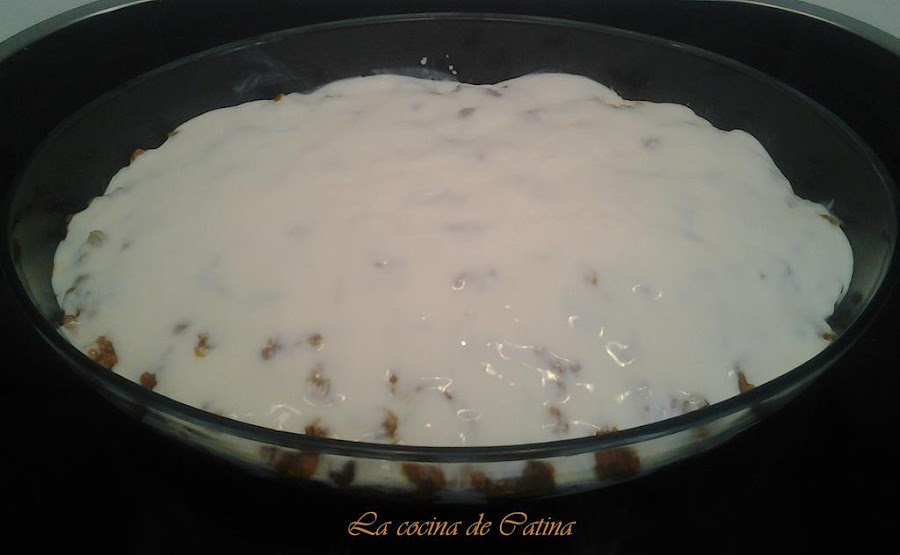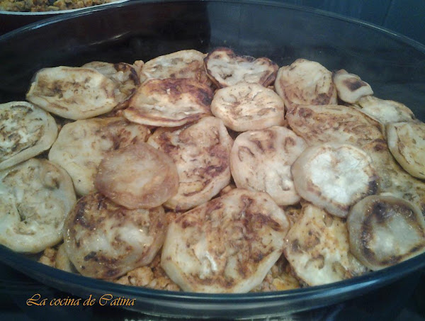En una fuente apta para horno, ponemos una primera capa de berenjenas, cubrimos con sofrito, volvemos con otra capa de berenjenas, sofrito y así mientras quede sofrito, la última capa que sea de berenjenas. Las cubrimos con bechamel, espolvoreamos el queso rallado por encima y metemos al horno precalentado a 180 grados durante 15 o 20 minutos hasta que el queso esté dorado.