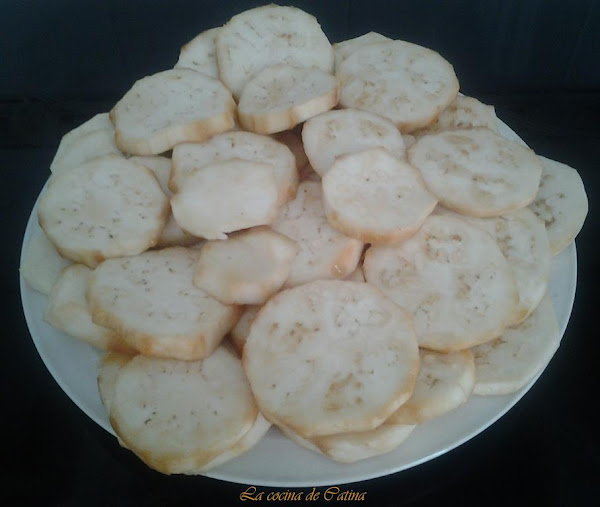 Pelar y cortar las berenjenas en círculos de medio centímetro de grosor y ponerlas en un recipiente con sal por encima durante una hora para que suelten el agua.