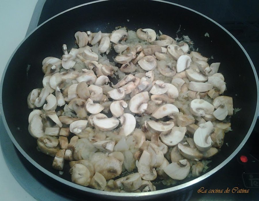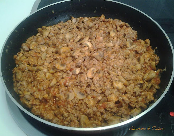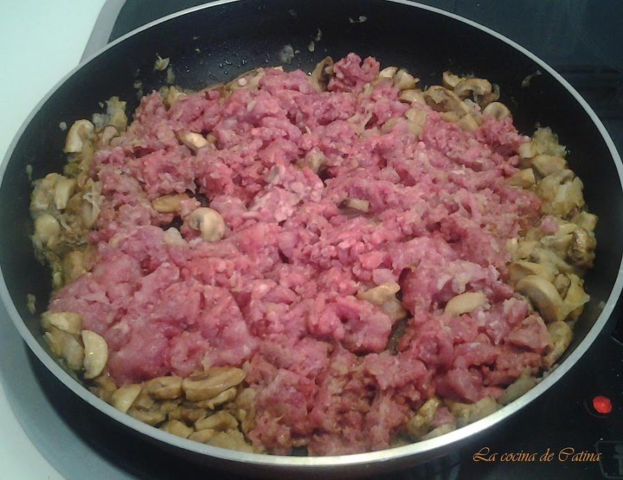 Añadimos los champiñones y seguimos friendo durante 5 minutos más. A continuación echamos la carne picada, salpimentamos y freímos durante 10 minutos. Añadimos el medio vasito de vino blanco, el tomillo y romero picado y las 6 cucharadas de tomate frito casero, mezclamos todo bien apagamos el fuego y reservamos.