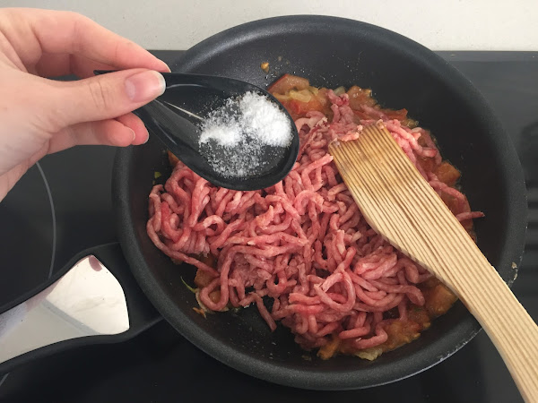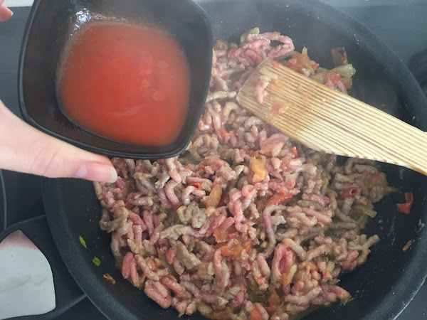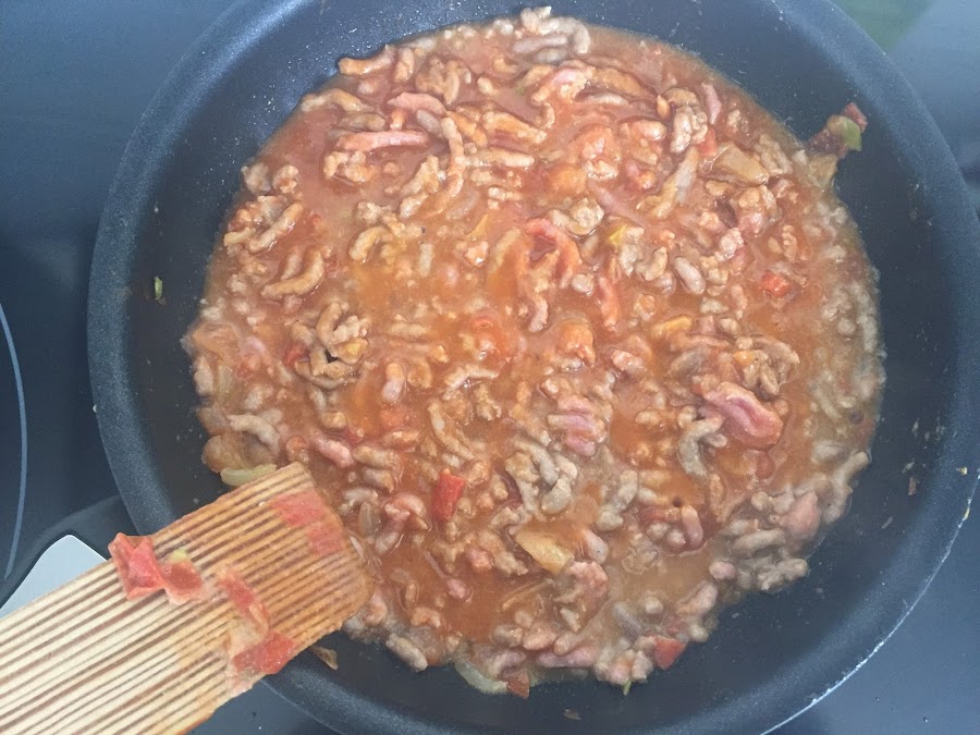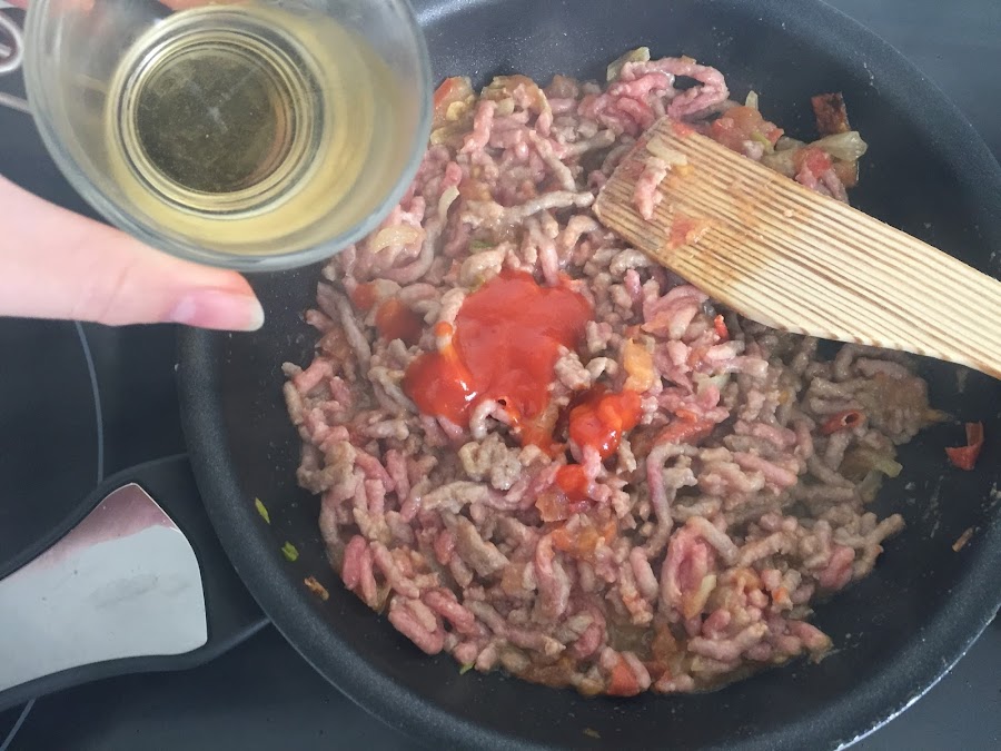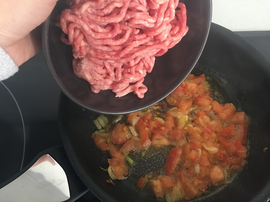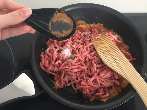 Una vez listo, añadimos la carne y cuando la tengamos a medio hacer añadimos el vino blanco, la salsa de tomate y las especias a nuestro gusto (sal, pimienta, canela y nuez moscado). Lo dejaremos cocer a fuego lento durante unos 15 min y mientras podemos ir preparando las berenjenas y la bechamel (receta aquí).