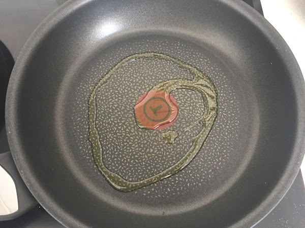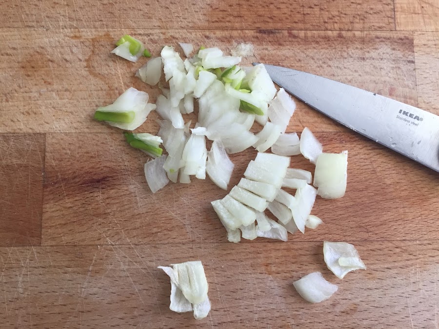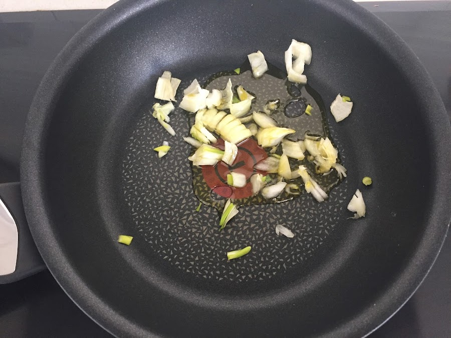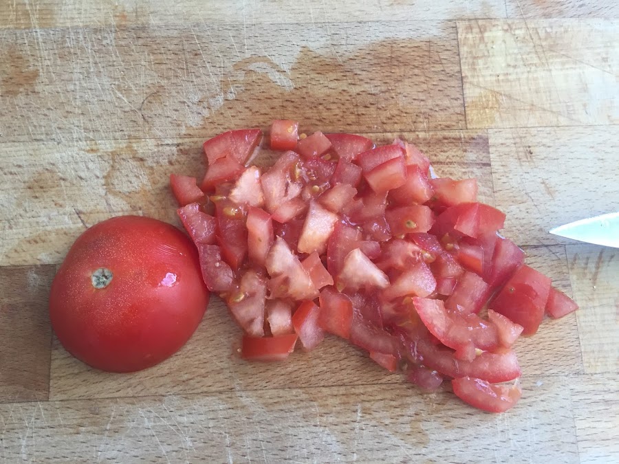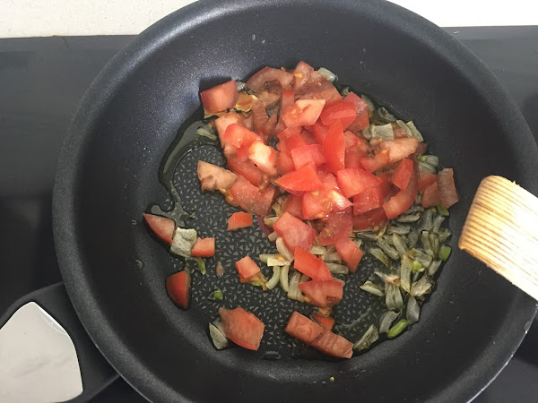 Primero cortamos la cebolla y la rehogamos en una sartén con un poquito de aceite, y acto seguido añadimos el tomate cortado en daditos para que se rehogue también.