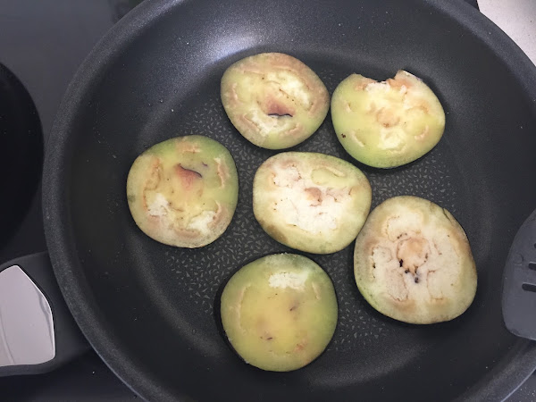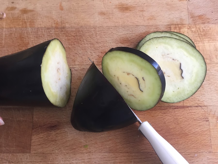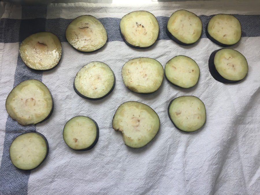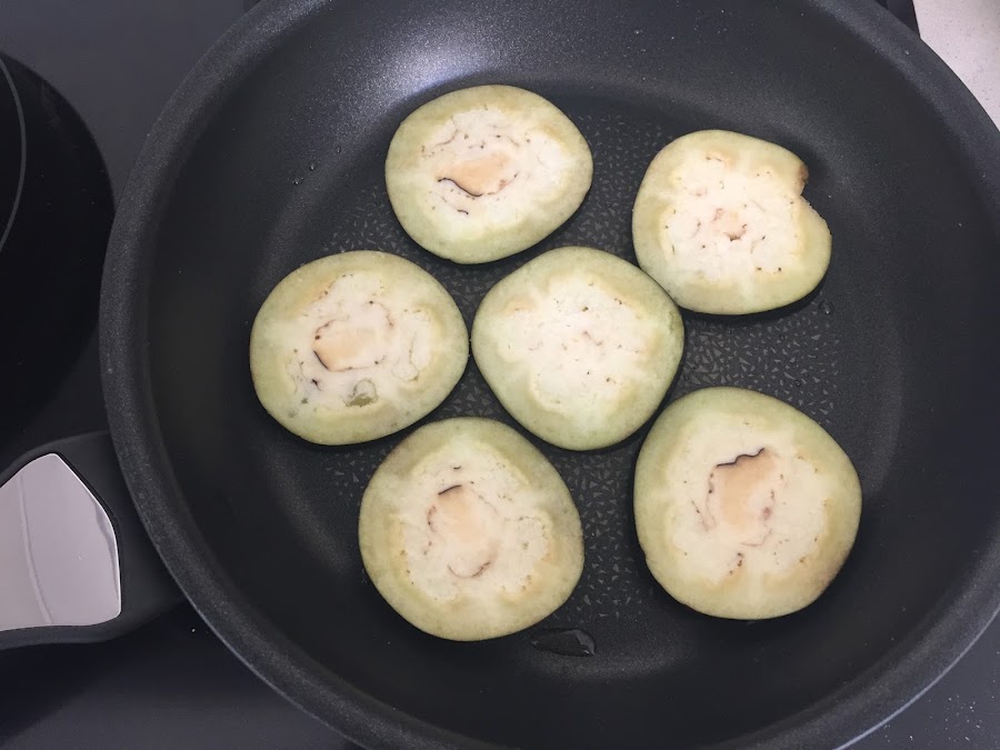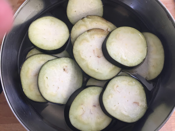 Para preparar las berenjenas, las lavamos, y las cortamos en rodajas de no más de medio cm, ya que no queremos que sean ni muy gordas ni muy finas. Las salpimentamos, las escurrimos bien en un paño de cocina y las vamos pasando por una sartén con un poquito de aceite para que se hagan un poquito. Reservamos y pasamos a formar la moussaka.