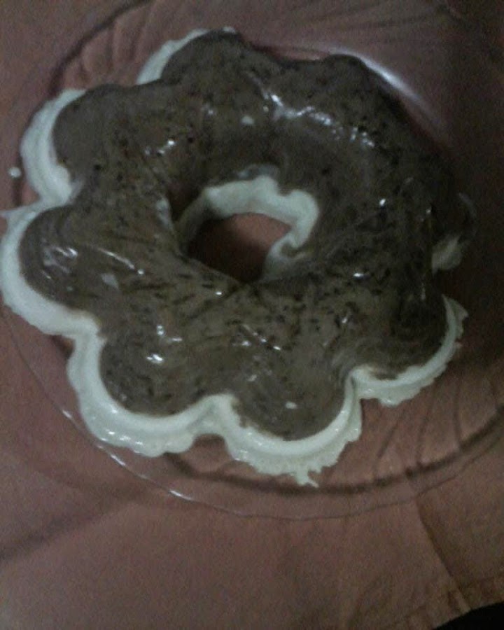 Llene hasta la mitad con su mezcla con su mousse de café en un molde decorado de plástico o de silicón y metalo al refrigerador, cuando este haya cuajado vierta la preparación de chocolate. Refrigere de nuevo y cuando vaya a servir puede decorarlo con ralladuras de chocolate o granillo de chocolate y un poquito de crema batida.