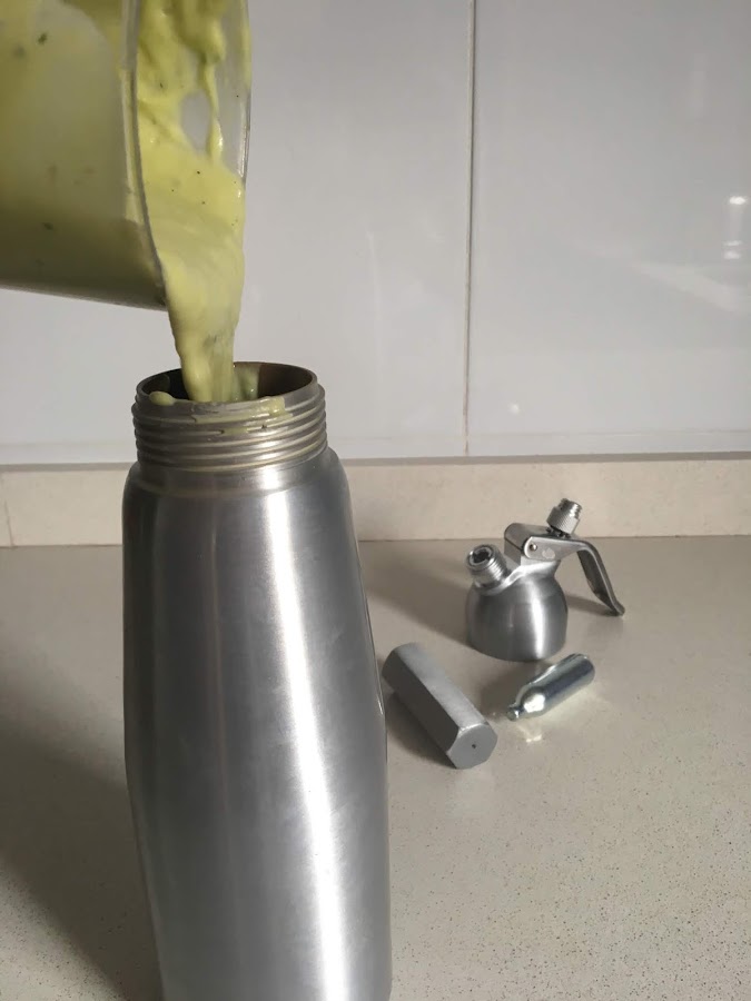 Ahora deberemos rellenar el sifón con la mezcla obtenida y luego enroscarle una carga de gas. Seguid las instrucciones del fabricante del sifón o de las cápsulas para hacerlo o pinchad en este enlace.