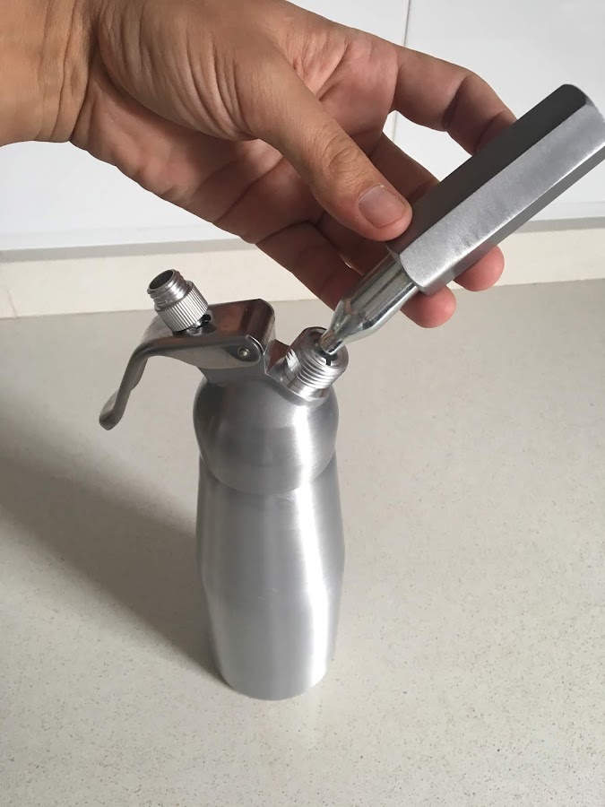 Una vez tenemos la carga de gas enroscada en el sifón deberemos agitarlo enérgicamente, tanto como podamos. Cuanto más agitemos y con cuanta más fuerza lo hagamos mejor será el resultado final.