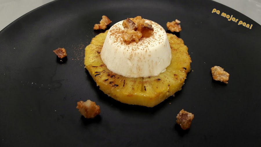 Por otro lado pelamos y cortamos nuestra piña en rodajas de 1 1/2 cm. Las pasamos a una sartén caliente con una par de cucharadas de mantequilla y otra de azúcar. Cuando hayan caramelizado las retiramos de la sartén y si queremos darle un toque más crujiente podemos añadir algo más de azúcar sobre cada rodaja y caramelizarlas un poco más con un soplete de cocina.