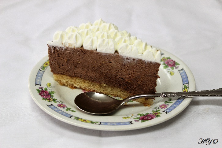 5. Llega el momento de montar nuestra tarta de choco-queso. En el fondo de un molde desmontable de 26 cm de diámetro colocamos la base de bizcocho. Esta base se puede sustituir por la típica de galletas con mantequilla, similar a la que utilicé en mi última mousse (VER AQUÍ). Encima vertemos la crema de choco-queso y alisamos la superficie con una lengua de cocina o en su defecto con el dorso de una cuchara. Dejamos que la mousse cuaje en la nevera entre seis y ocho horas (yo suelo hacerlas de un día para otro).