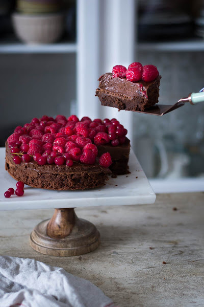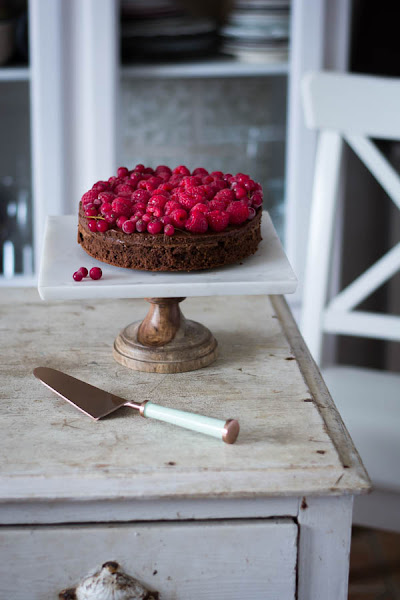 Cuando esté horneado, lo sacamos a una rejilla y dejamos que se enfríe, una vez frío ponemos el resto de la mousse que teníamos reservado y decoramos con las frambuesas y frutos rojos de nuestra elección.