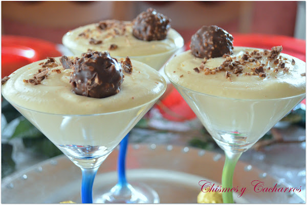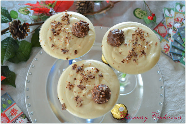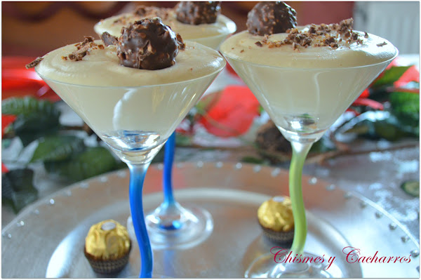 Sacar el mousse del frigo y rellenar los vasos, colocar el bombón arriba y decorar. Meter al frigo y servir al postre.
