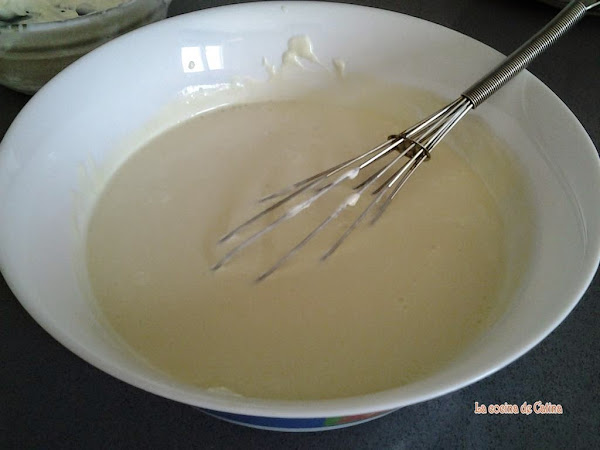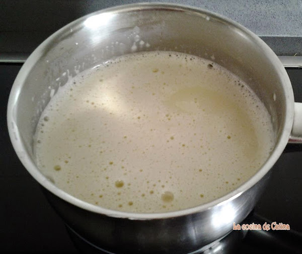 Deshacer el chocolate blanco en el microondas durante unos segundos y añadirlo a la crema anterior, todavía caliente. Batir con unas varillas de mano hasta que el chocolate se funda.
