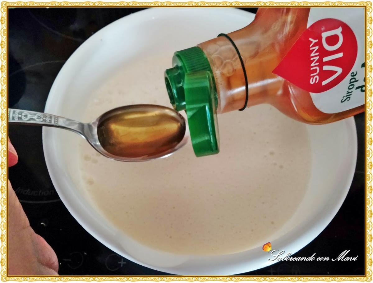 Semi montar el resto de los 500ml de nata (crema de leche) y añadir la cucharada del azúcar vainillado y la cucharada de Sirope de Agave.
