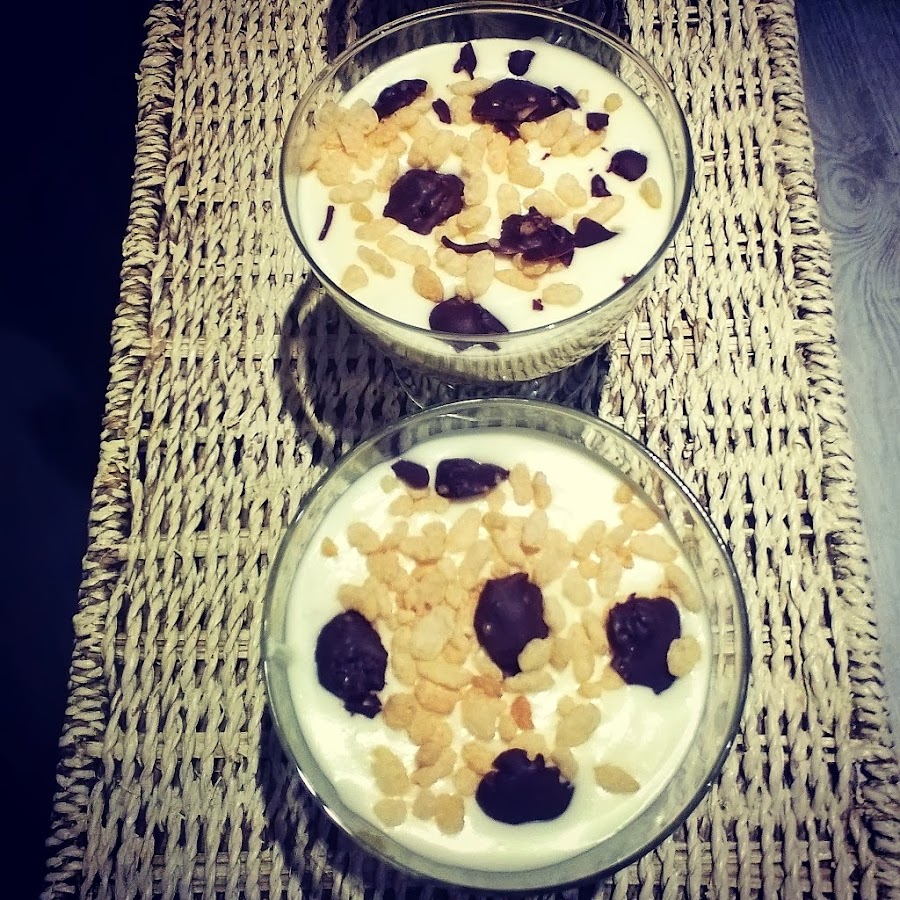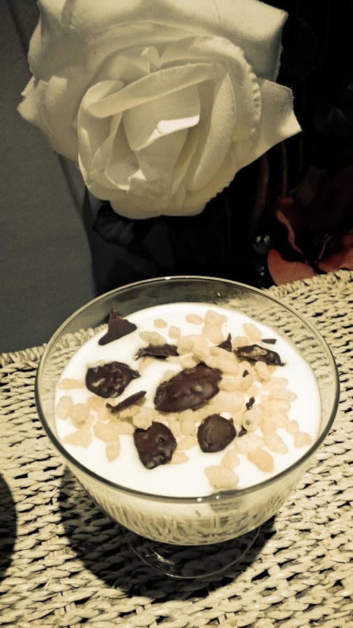 Lo metemos en la nevera unas horas o un día* y cuando esté listo para servir, espolvoreamos unos cuantos granos de arroz inflado en cada vaso. Si lo hacemos con demasiada antelación se ablandarán y perderán su crujido mágico.