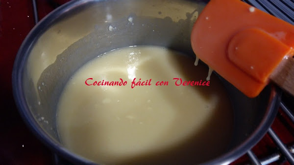 Lo ponemos al baño María con 50 ml de la nata (crema de leche), así nos quedará más cremoso y más fácil de unir a la nata montada (crema de leche).