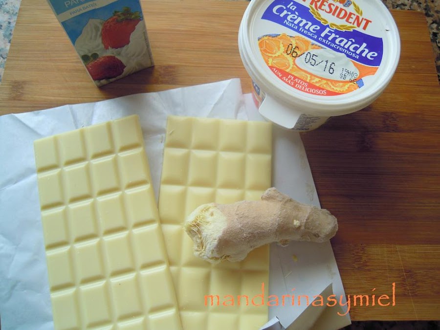Derrite poco a poco el chocolate blanco con unos 50ml de la nata (crema de leche). Yo le pongo un poco de nata (crema de leche) para que no se queme el chocolate.
