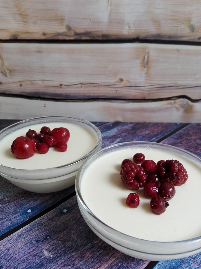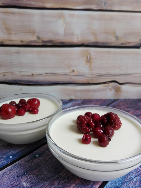 Opcional: Fruta para decorar al gusto (yo he utilizado una lata de frutos rojos en almíbar del mercadona y la combinación es muy buena).