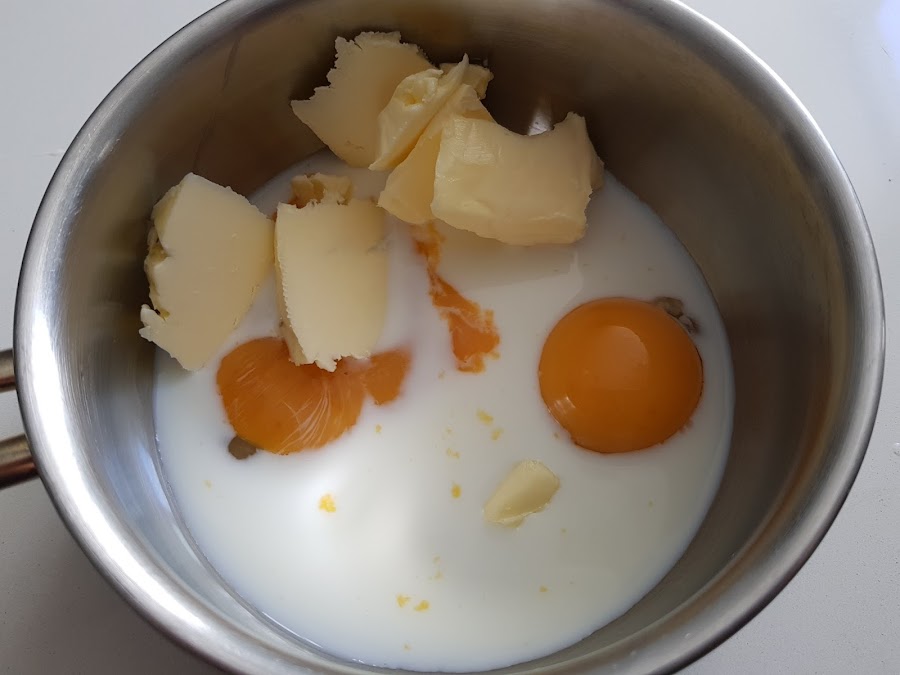 1. - Comenzamos haciendo una especie de natilla, poniendo en un cazo las yemas de huevo, la leche, la mantequilla y el azúcar. Reservamos las claras.