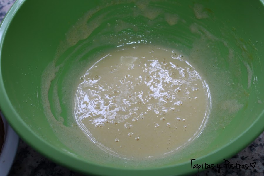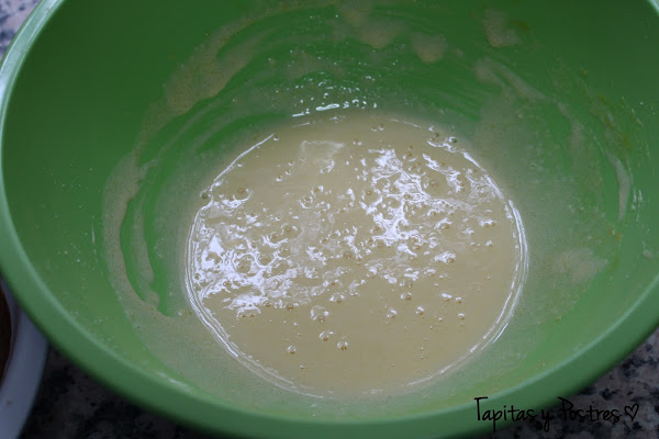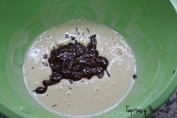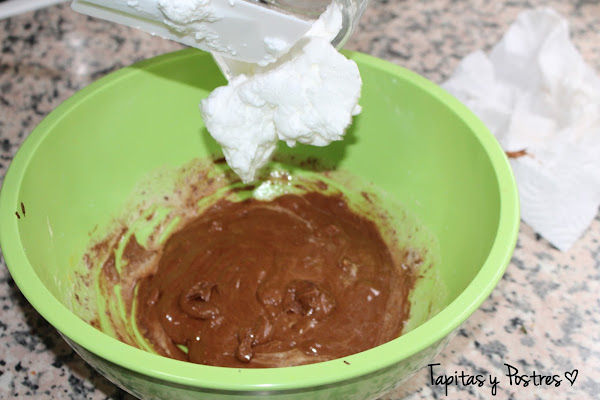 Separamos las claras de las yemas y blanqueamos las yemas con el azúcar glass unos minutos hasta que doblen el tamaño. Agregamos a esta mezcla el chocolate fundido y removemos muy bien.