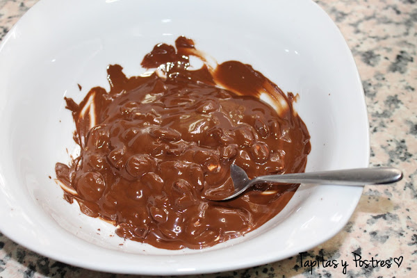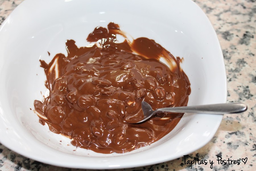 Derretimos el chocolate con almendras en el microondas en tandas de 30 segundos, hasta que lo veamos fundido.