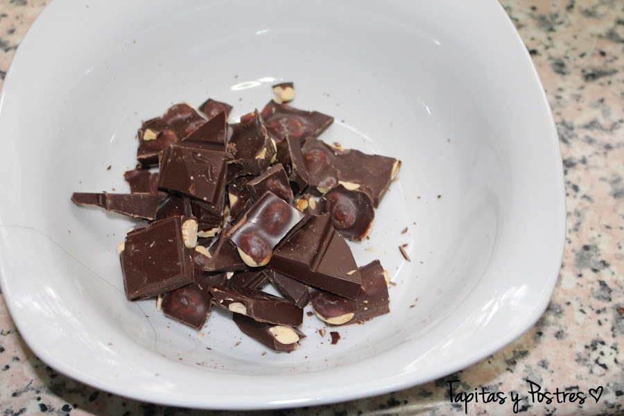 Vamos a fundir el chocolate en el micro, lo troceamos y lo calentamos a intervalos de 30 segundos, que si no se nos puede quemar. Yo he usado chocolate sin azucar y con almendras enteras, pero podéis usar el chocolate que mas os guste.