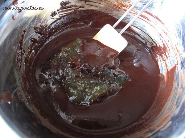 Derretir el chocolate al baño maría y una vez derretido, retirar del fuego pero seguir manteniendo en el baño maría caliente.