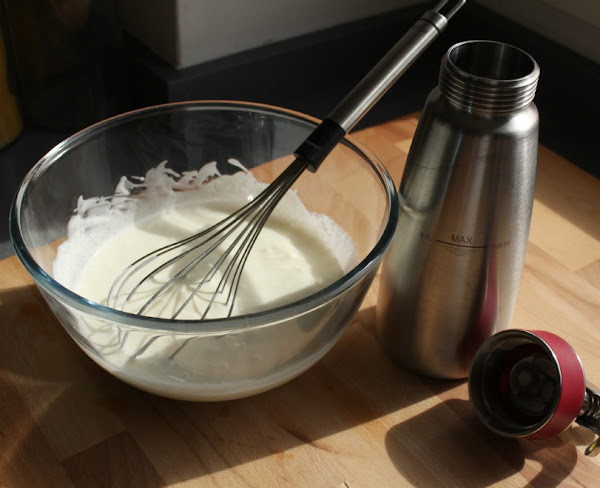 A la hora de servir, agitamos el sifón con energía y muy poco a poco vamos rellenando los vasitos con la espuma de coco.