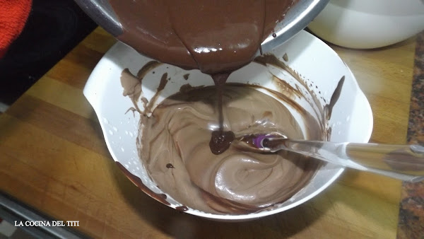 7º Mezclamos el chocolate con la nata (crema de leche) y como bien sabemos a la hora de hacer una mousse una espatula de silicona y en movimientos envolventes y poco a poco.