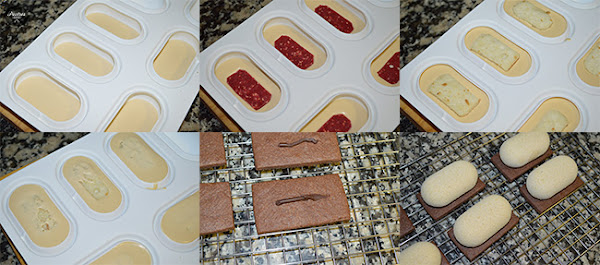 Ya tan solo nos queda colocar las piezas sobre los rectángulos de sable, para que nos queden bien enganchados podemos poner un poco de ganache de chocolate encima de los sables antes de poner las piezas.